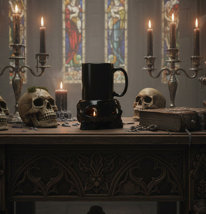 Skull mug warmer. Light the sacred flame of rituals long past to evoke a purifying warmth that will drive out the demons of discomfort through an incantation and a Witch's brew.