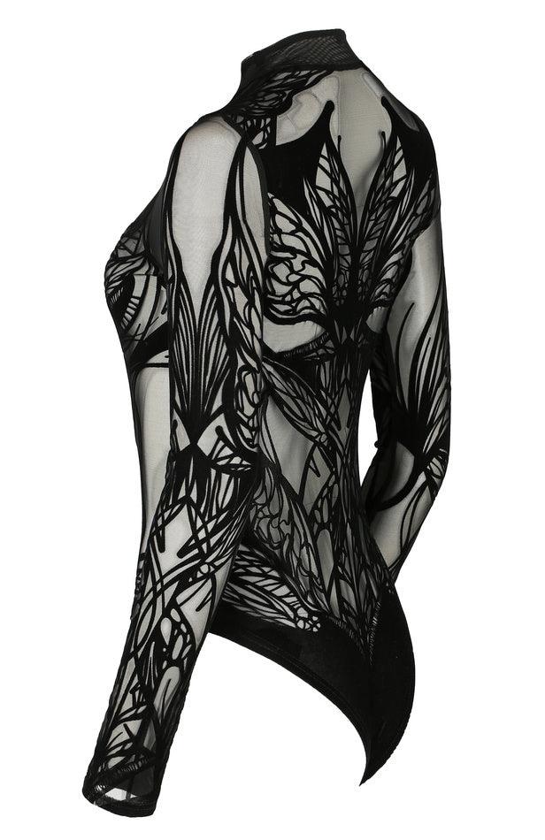 The juxtaposition of opaque black patterns against transparent mesh creates a mesmerizing play of light and shadow. The deep black color is a hallmark of the flocking process. It’s not only visually striking but also enduring. The turtleneck effortlessly slips over your head, gently enveloping your neck in comfort. The gothic bodysuit is secured solely at the bottom with two press studs.