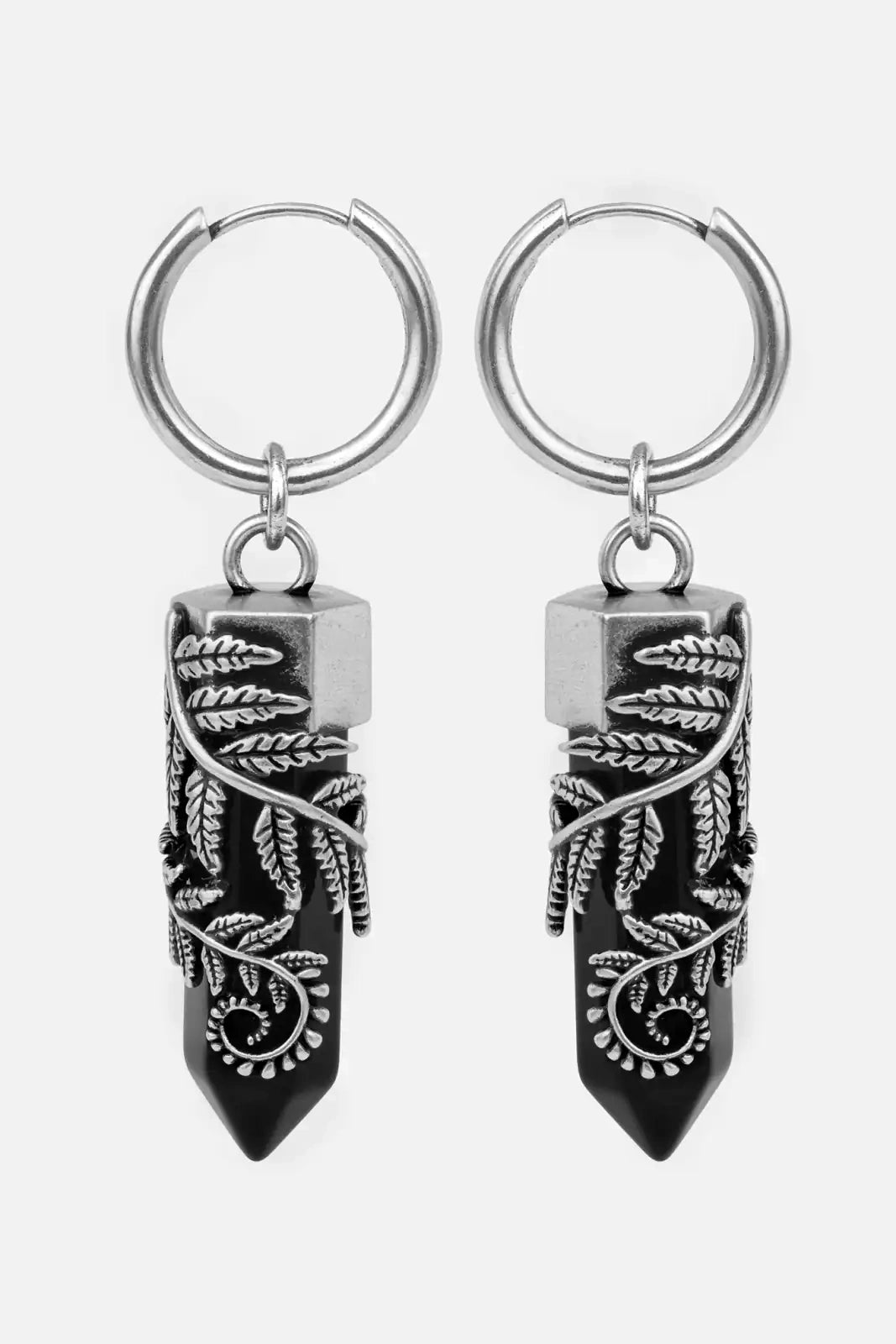 These crystal point earrings were made for dark souls. Their pendant design channels witchy energy through every detail. A sculpted fern leaf curves protectively around a sharp black crystal.