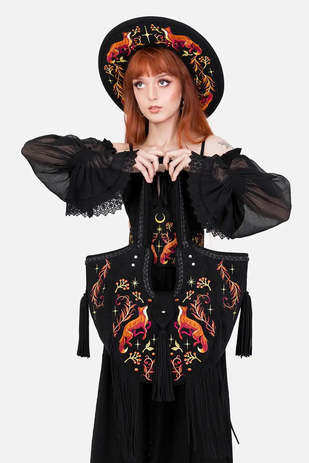 A mystical black fox hat with a wide brim, adorned with fiery, intricate “Fireborne” embroidery – perfect for lovers of witchy style and bold, elemental looks. The embroidery depicts spirited foxes surrounded by flame-like botanical motifs, blending untamed energy with dark, magical elegance.