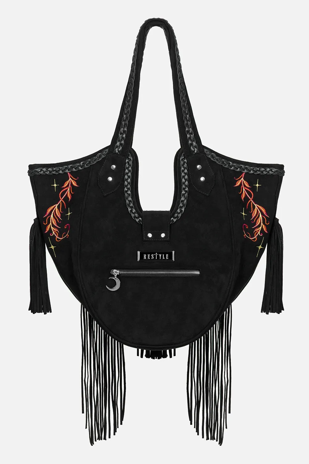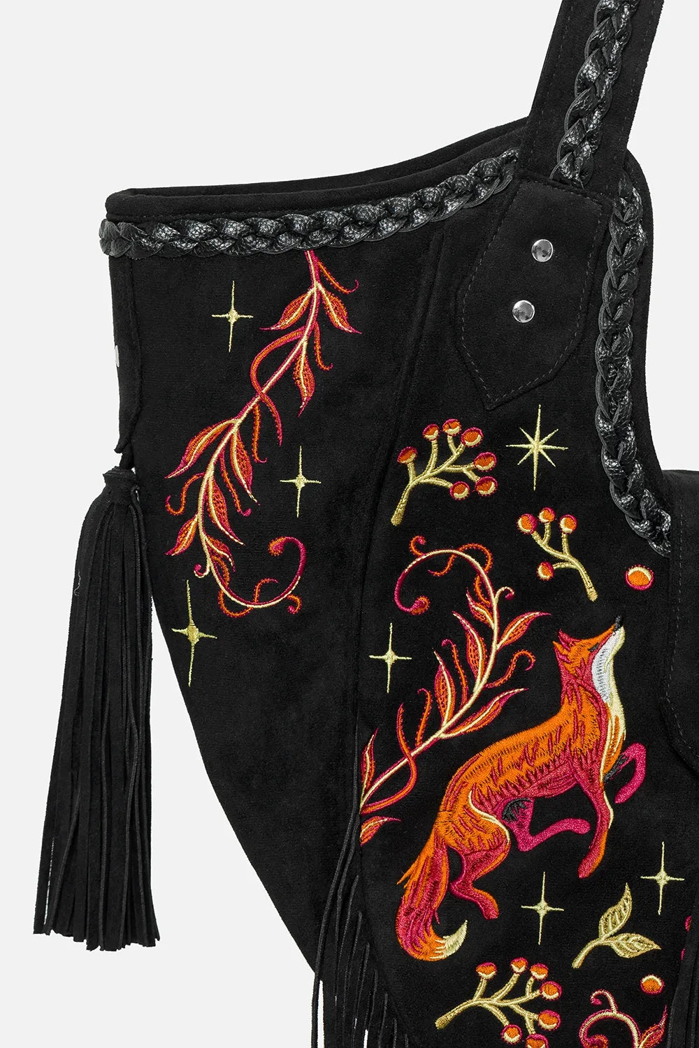 š¦š¾Ā FOX MEADOWS BAG ā Oversized Black Faux Suede Shoulder Bag with Fox Embroidery & Fringe DetailsĀ š