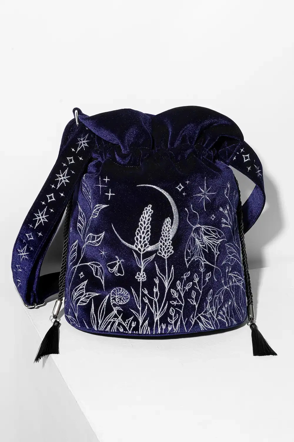 AĀ midnight blue velvet bucket bagĀ that captures the magic and mystery of the night sky. Its deep, rich navy hue provides the perfect backdrop forĀ silver metallic celestial embroidery, depicting a moonlit meadow with luna moths, night-blooming flora, stars, and a crescent moon. The shoulder strap is adorned with silver star embroidery, adding a whimsical, celestial touch. This navy blue velvet embroidered bag is ideal for dark fantasy or celestial-inspired looks, perfect for everyday use, work, or magical outings.