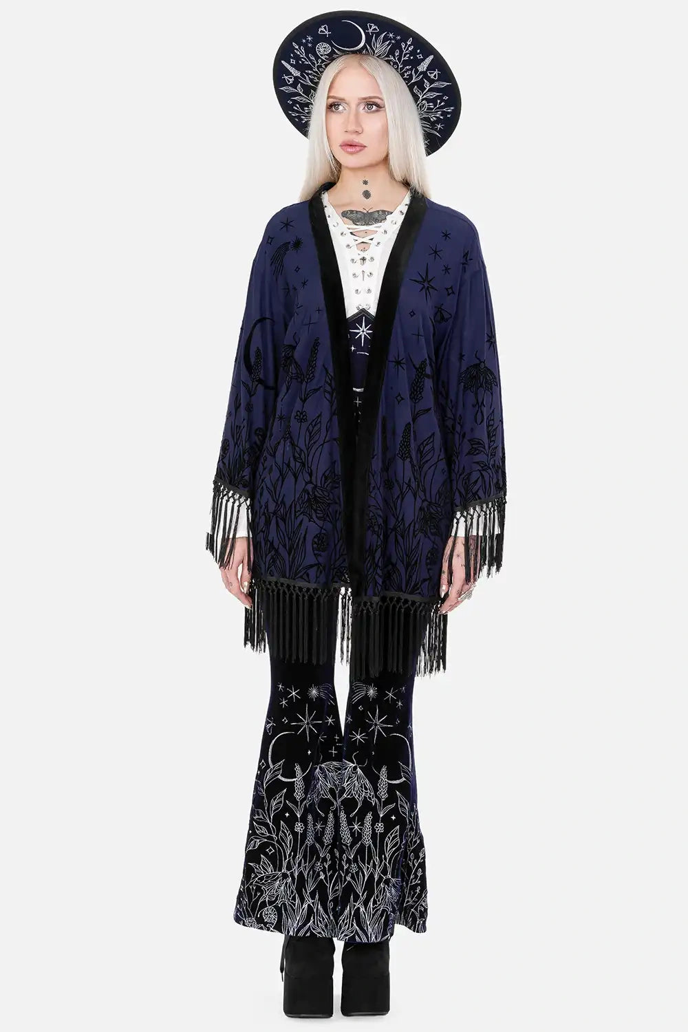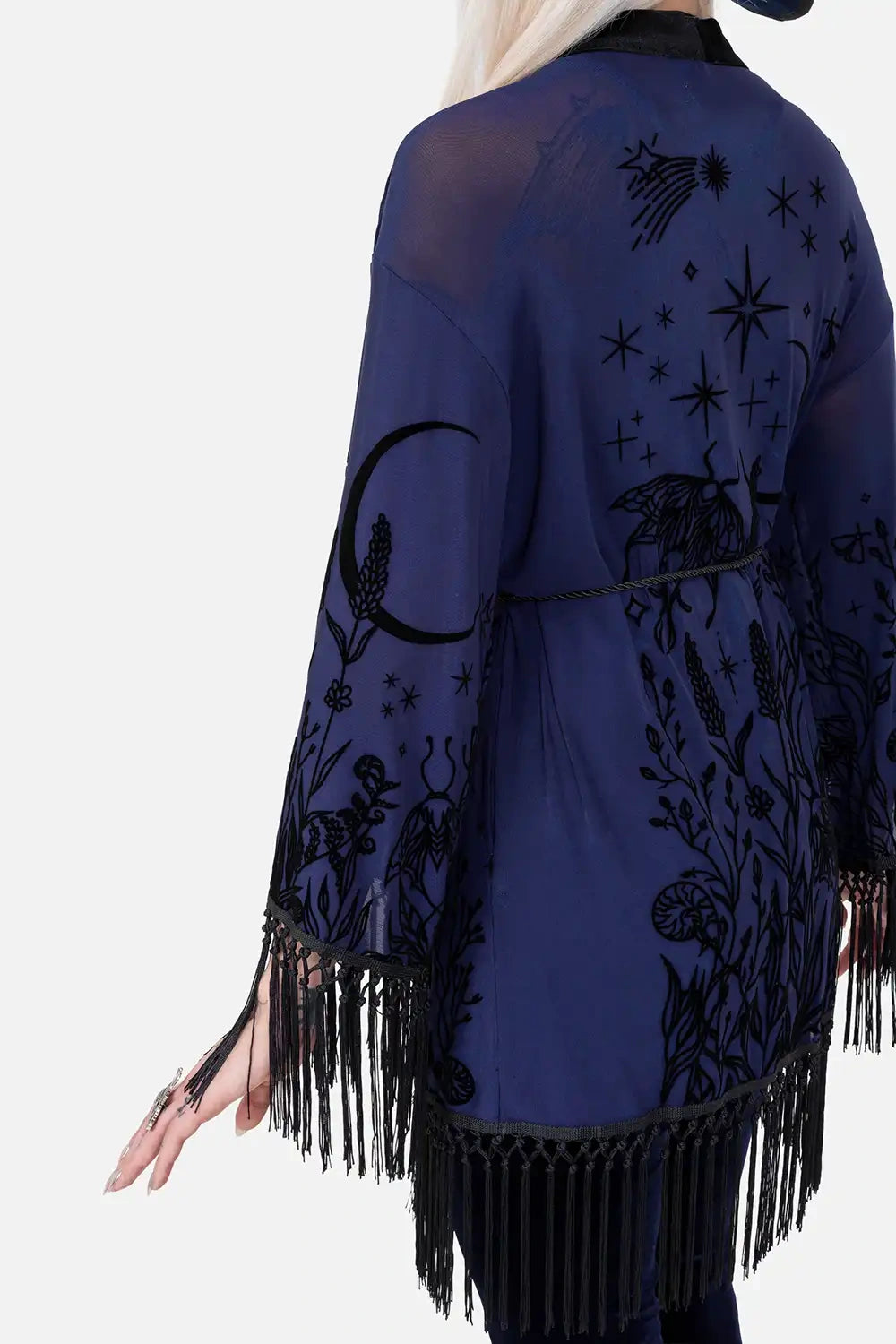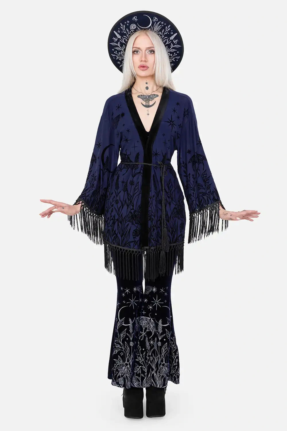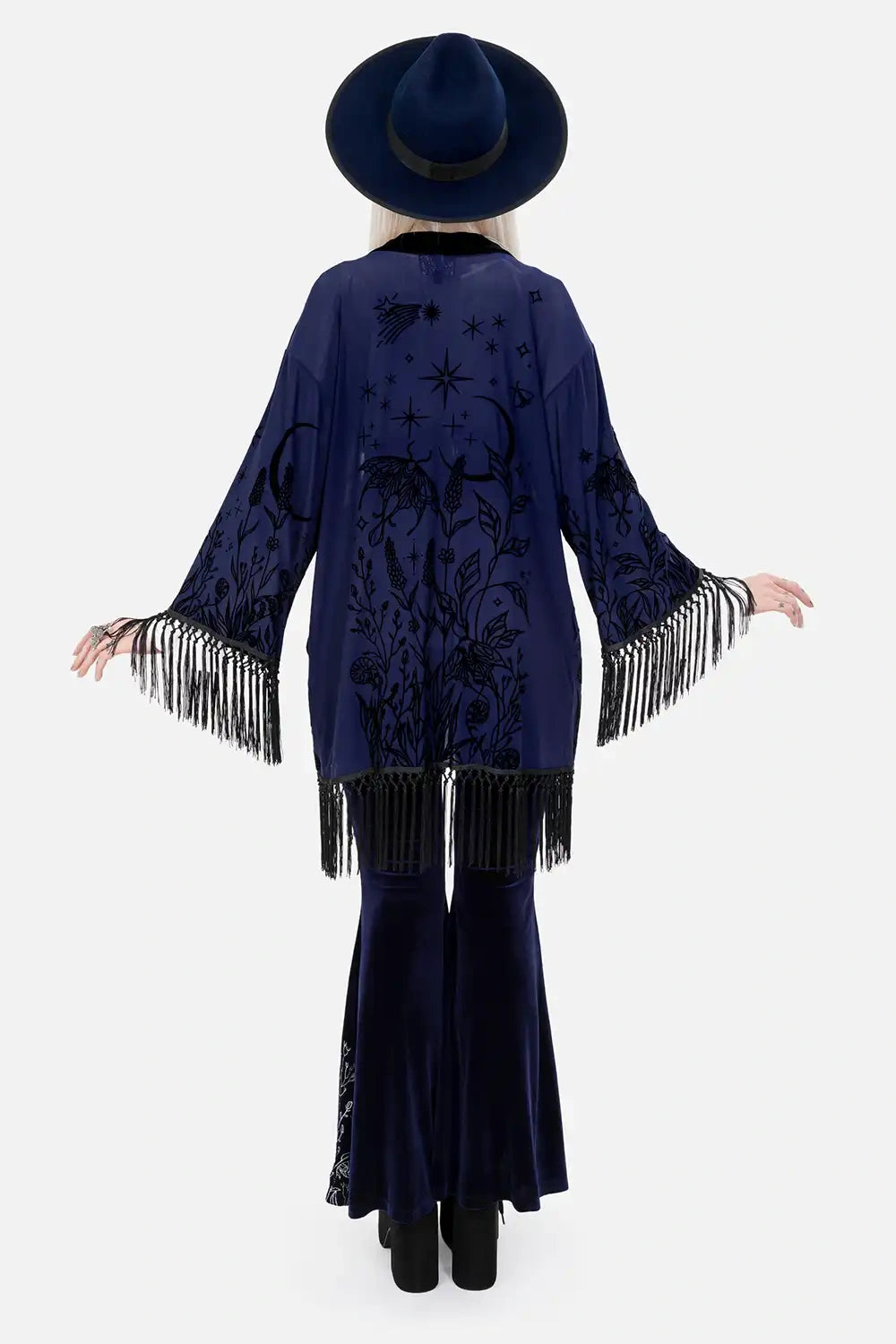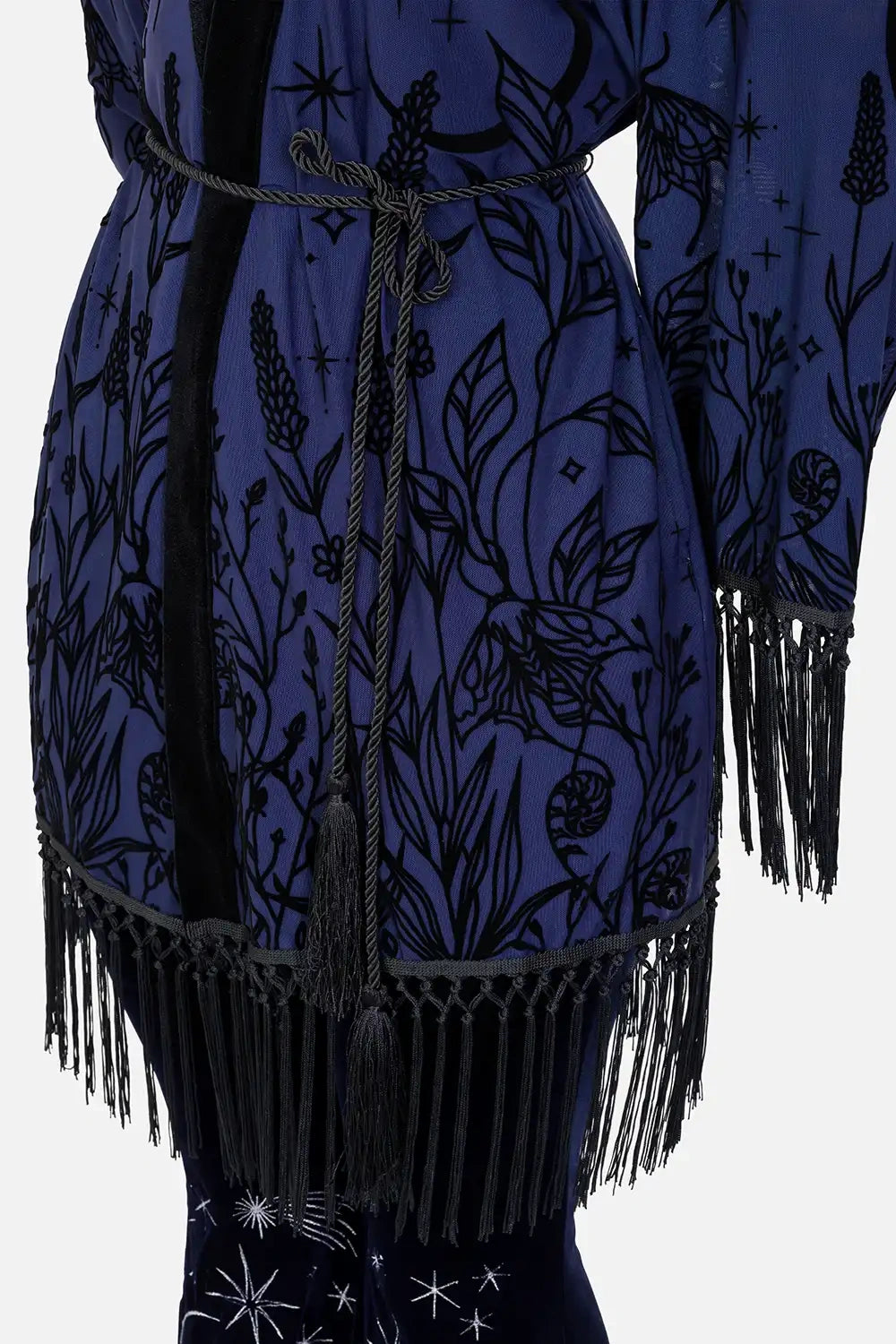š šĀ MOON GARDEN KIMONO ā Midnight Blue Kimono with Celestial Print and Fringes
