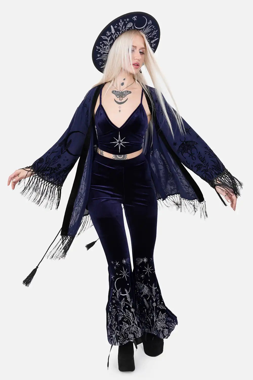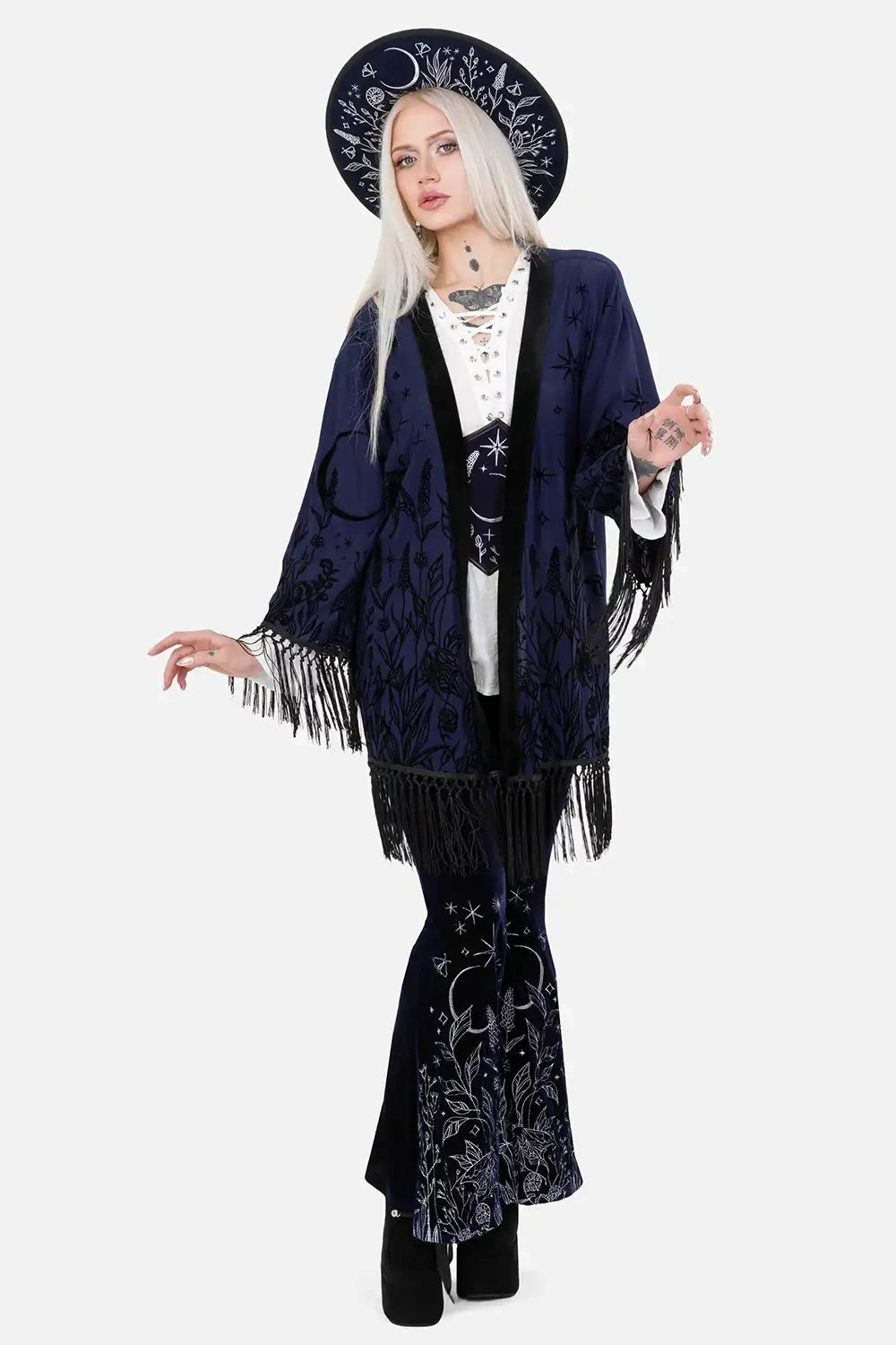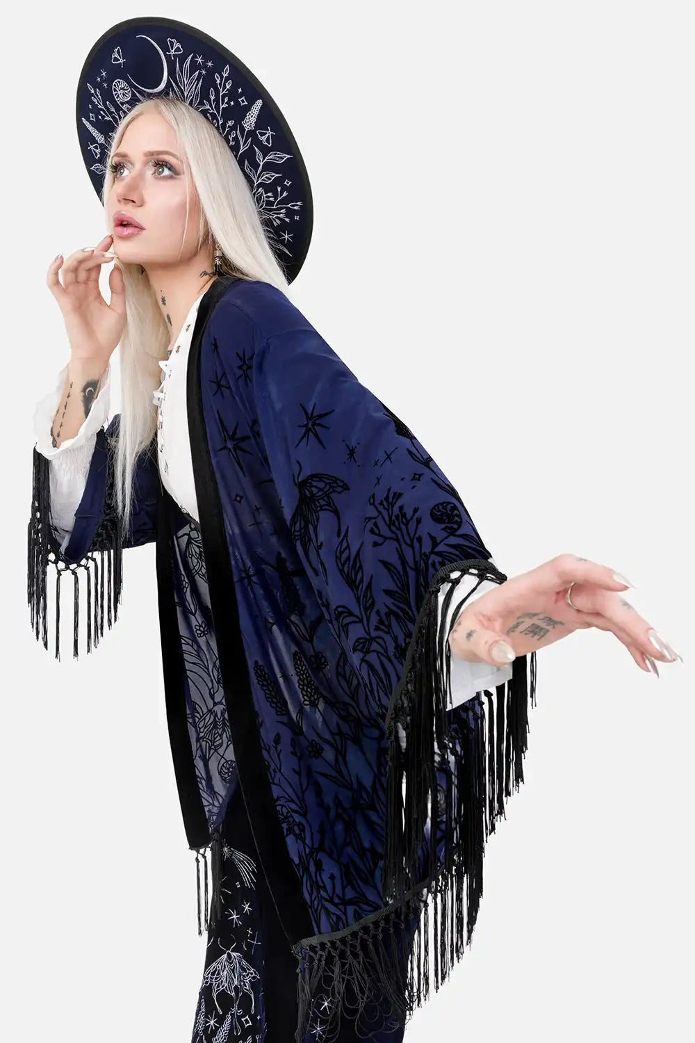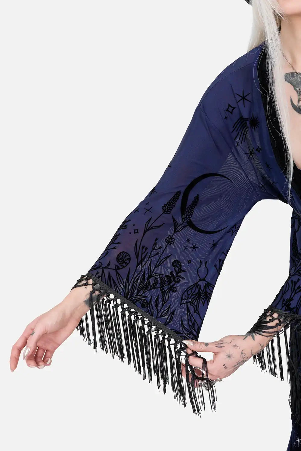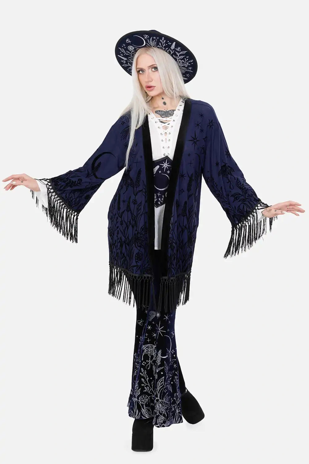 š šĀ MOON GARDEN KIMONO ā Midnight Blue Kimono with Celestial Print and Fringes