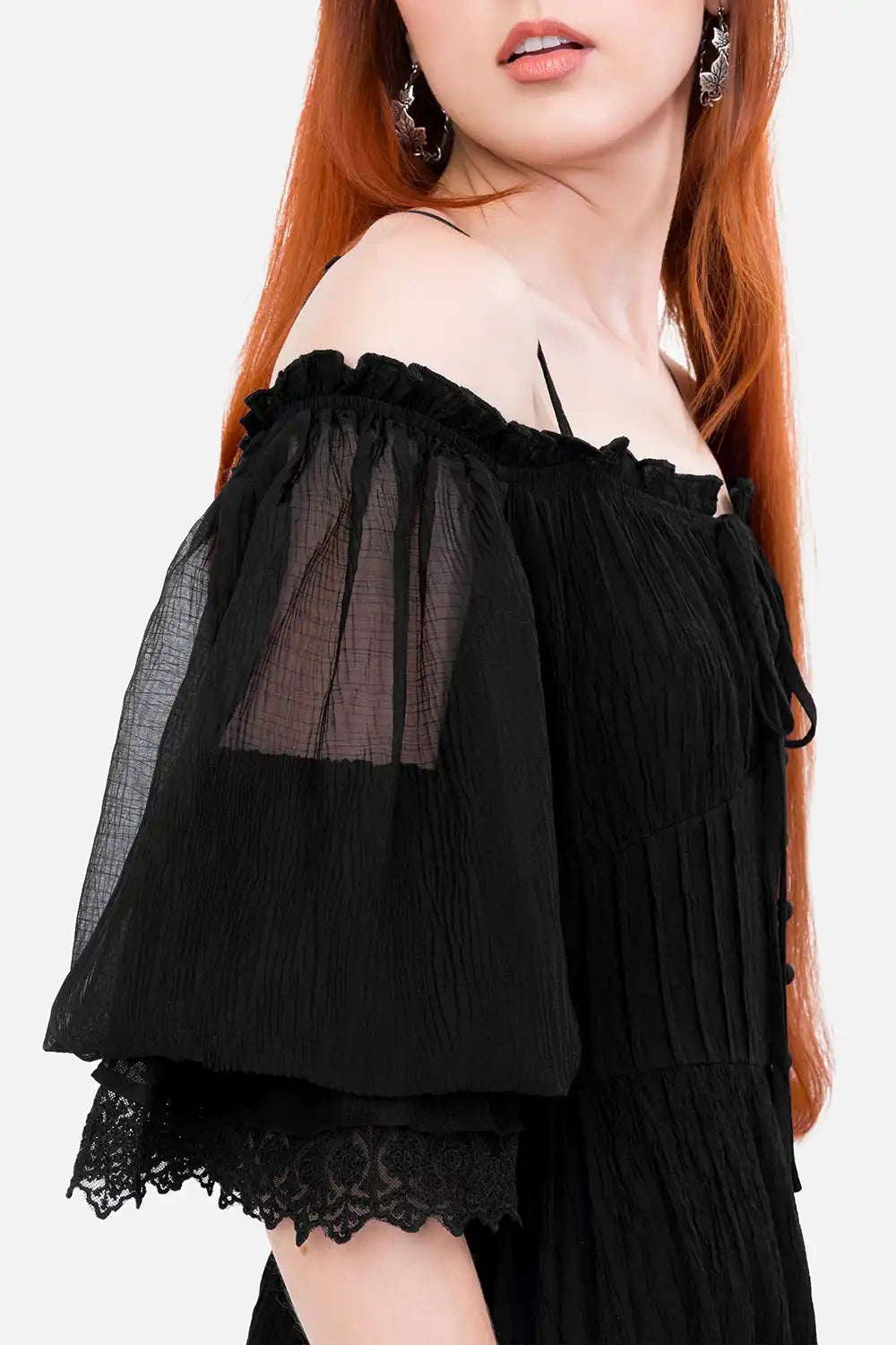 The highlight of this piece lies in its dramatic semi-sheer long sleeves – light as air, finished with soft ruffled lace trims. Whether worn loose and romantic or rolled to the elbows, they add a touch of enchantment to every movement.
