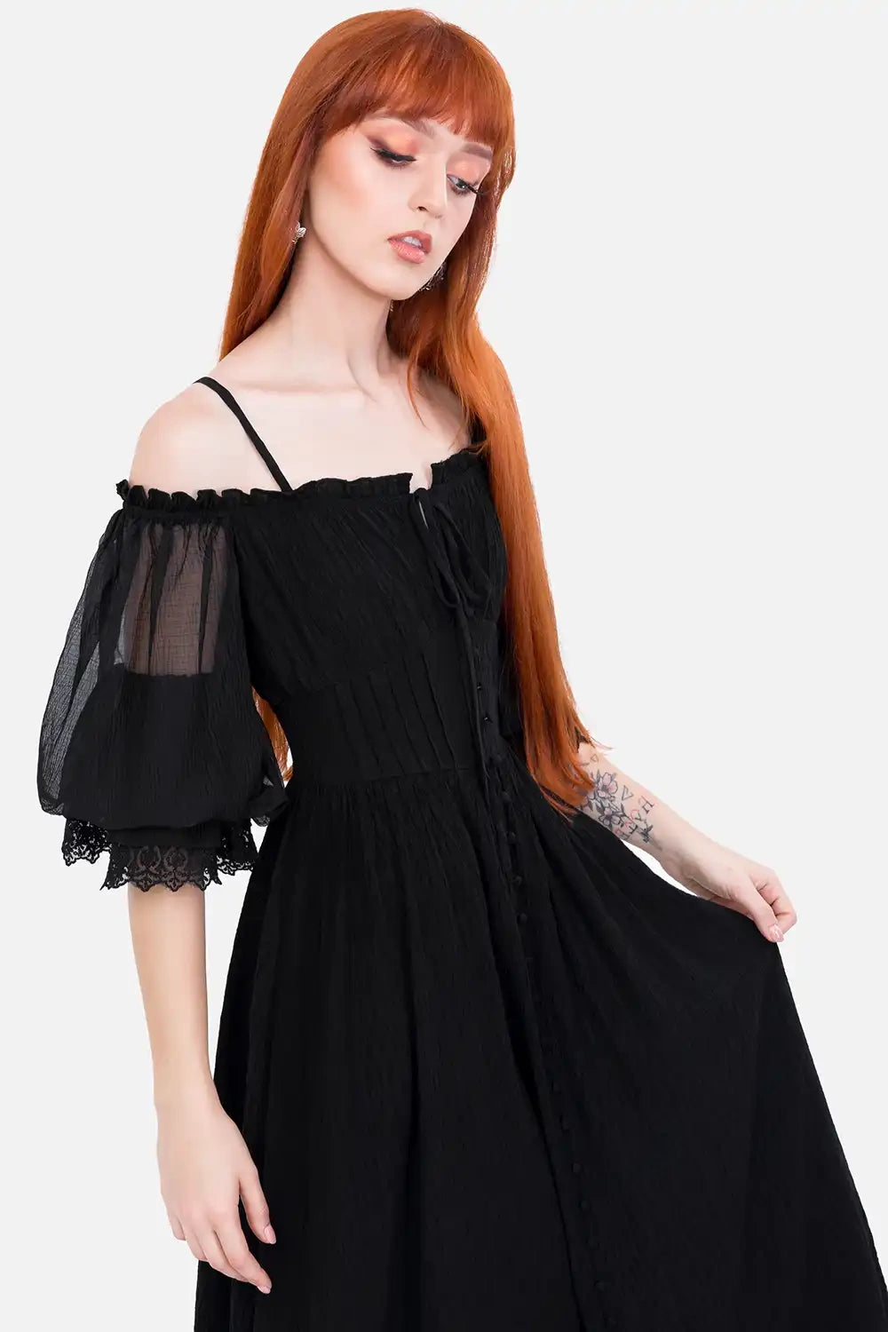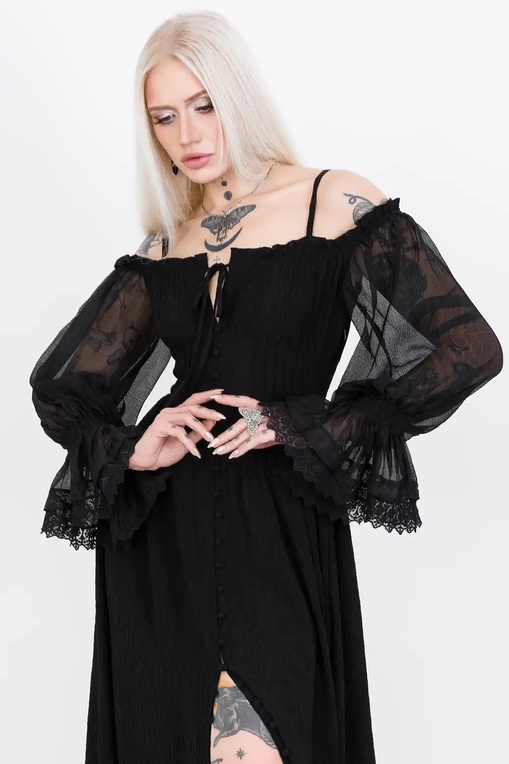 A flowy gothic maxi dress woven with the essence of dark romance and witchy elegance. Its floaty, ethereal silhouette evokes the mystery of midnight gatherings and forest rituals. Perfect for those who adore trad goth, whimsigoth and gothic boho styles, this black fantasy dress drapes beautifully and pairs effortlessly with corset belts or layered jewelry for a truly spellbinding look.