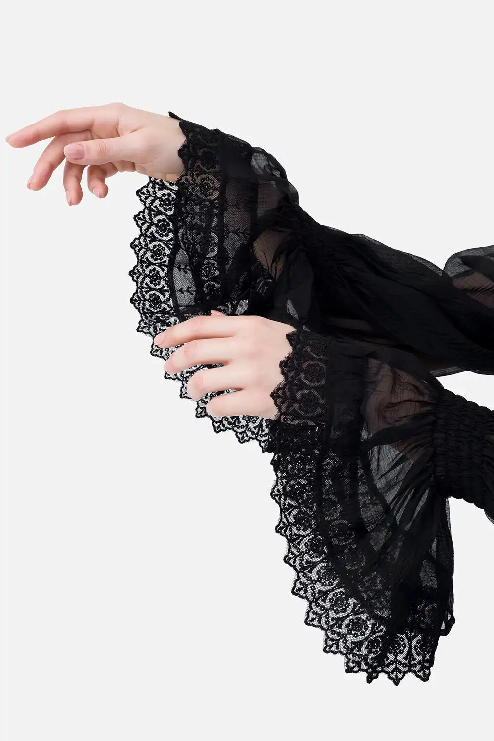 ✦ Voluminous, semi-transparent poet sleeves with delicate lace ruffle trim