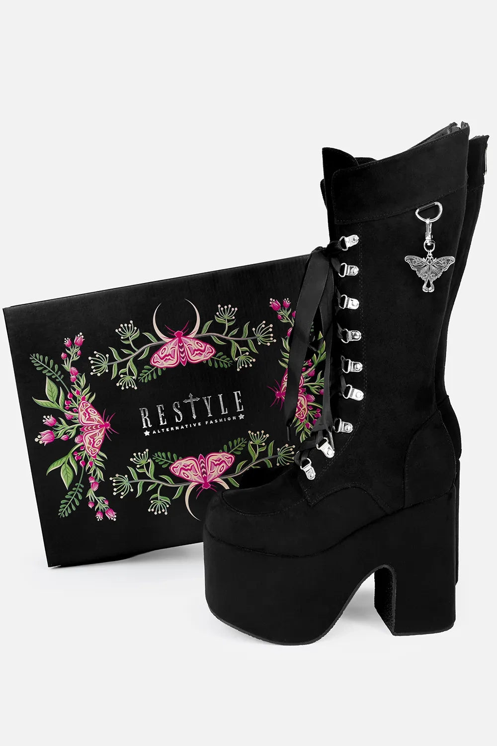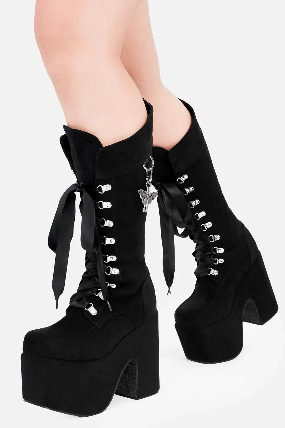 Do you walk the world when others sleep? The Night Wanderer Platforms are made for twilight souls — those drawn to the moon, the quiet streets, and the magic of midnight. These dramatic black faux suede platform boots blend bold height with delicate, gothic details. With silver hardware, satin ribbon laces, and removable moth charms, they’re equal parts powerful and poetic.