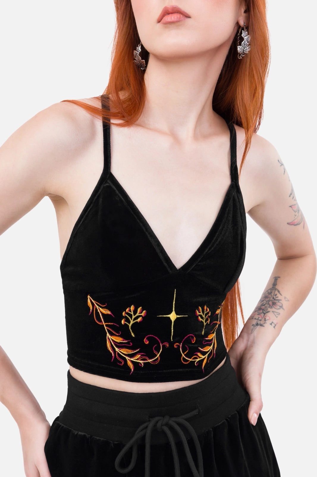 AĀ black crop top with autumnal plants embroidery, inspired by the wild magic of the forest at twilight. The fiery embroidery evokes flames, tongues of fire, and forest life, blending whimsigoth and mystical fire-inspired aesthetics. Perfect for creating dark forest, nature-inspired, or boho outfits, this versatile top pairs effortlessly with Fireborne collection pieces for a bold, elemental look.