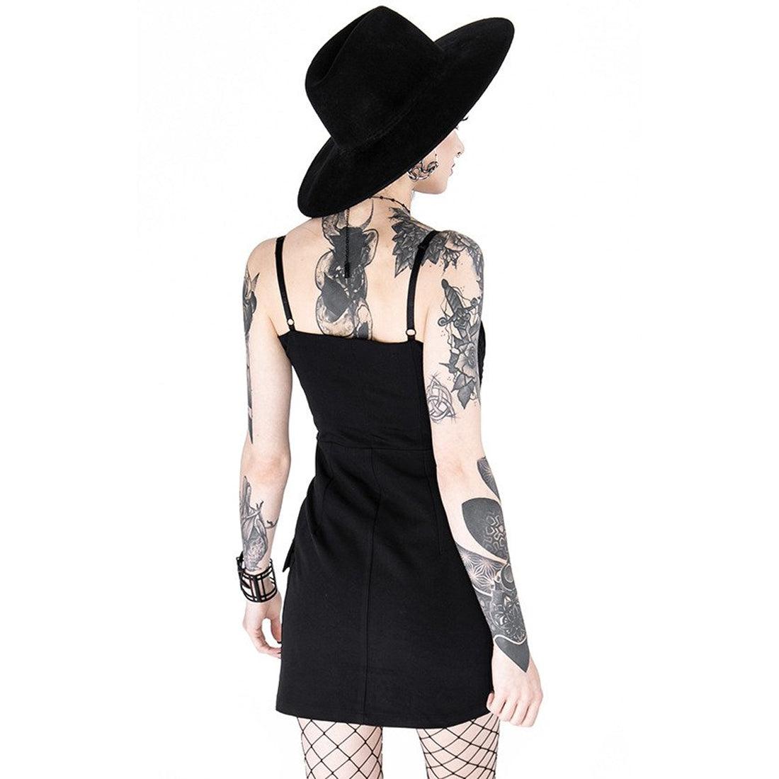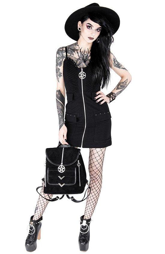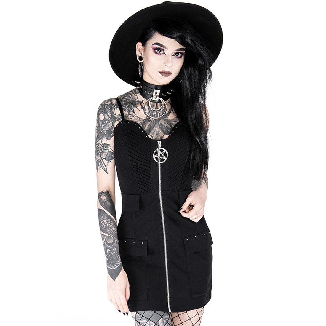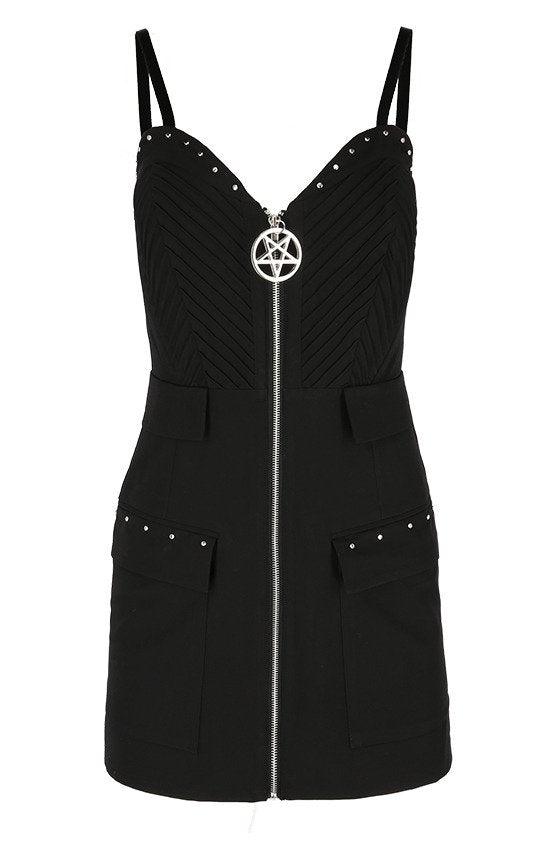 Dress fastened at the front with a metal zipper finished with a pentagram slider.