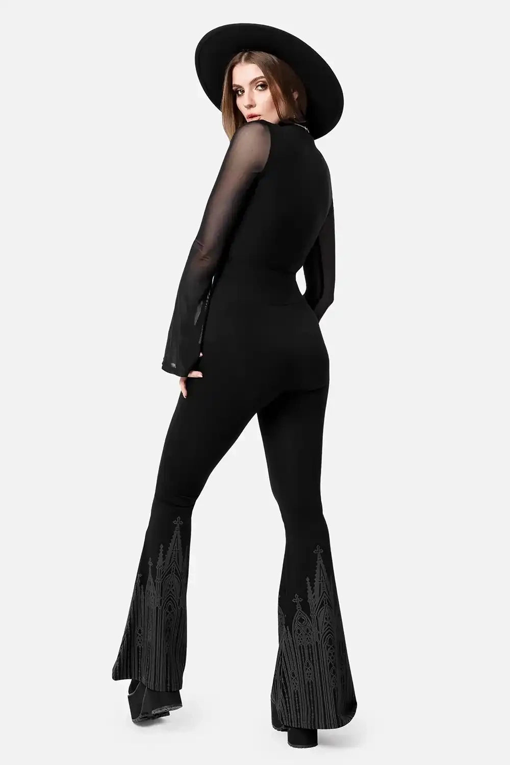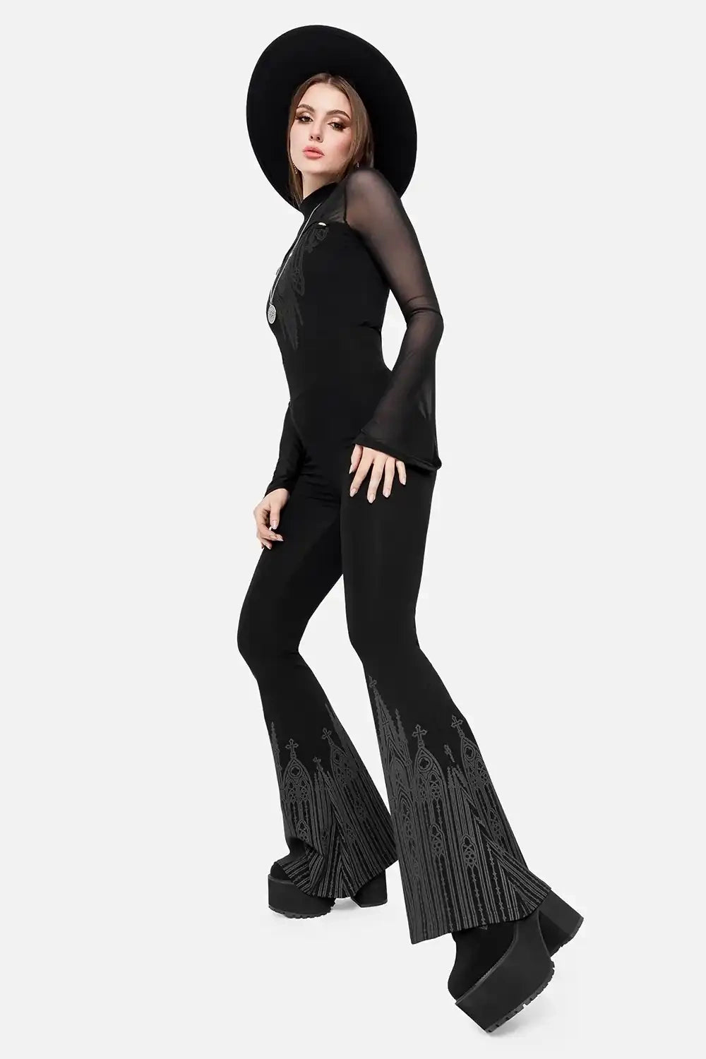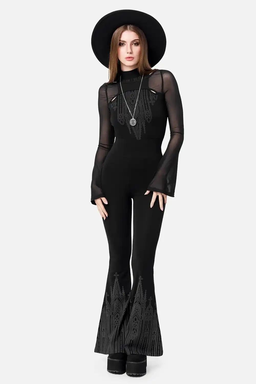 This gothic top with cathedral print is made to enchant with its elegant design. Sheer mesh flared sleeves bring a dramatic, flowing elegance to the look. The high neck adds bold, witchy sophistication. Cut-out details at the chest and shoulders complete this alternative fashion statement. Perfect for lovers of dark romantic and corpo goth style.