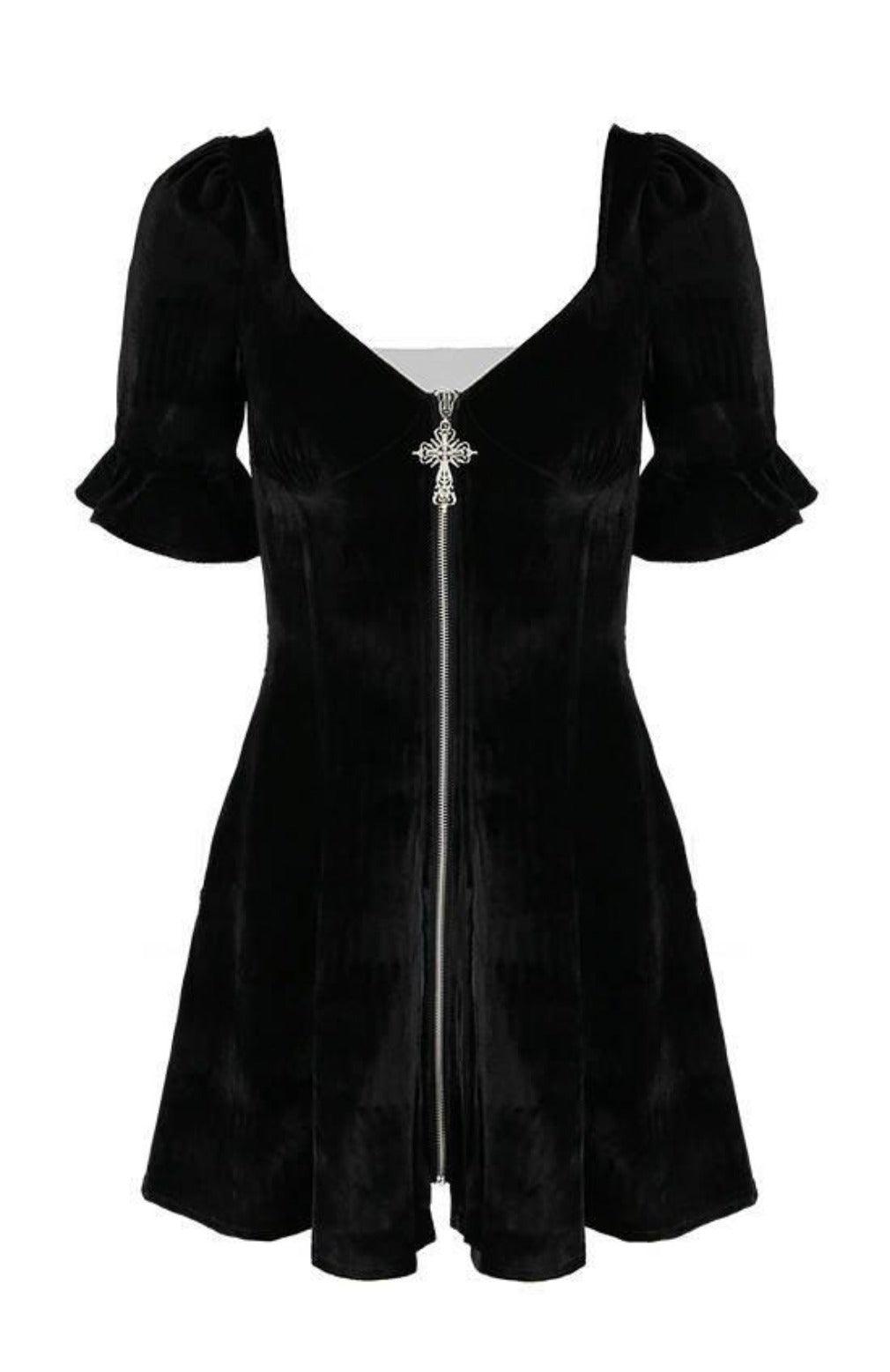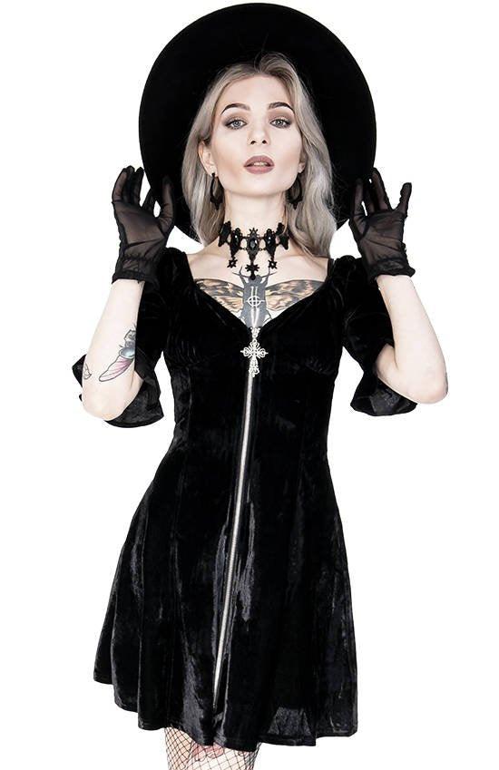 The gothic dress has a deep sweetheart neckline that highlights the bust. It’s feminine, sensual, and bold. The dress is fastened at the front with a metal zipper with a cross pull. The ¾ sleeves are slightly puffed and have an exquisite frill. The dress has a geometric A-shape, which means a tight waist and a flared hem. Thanks to this, it emphasizes the waist and gives you the hourglass silhouette. It’s cut out at the back and trimmed with a hidden elastic band.