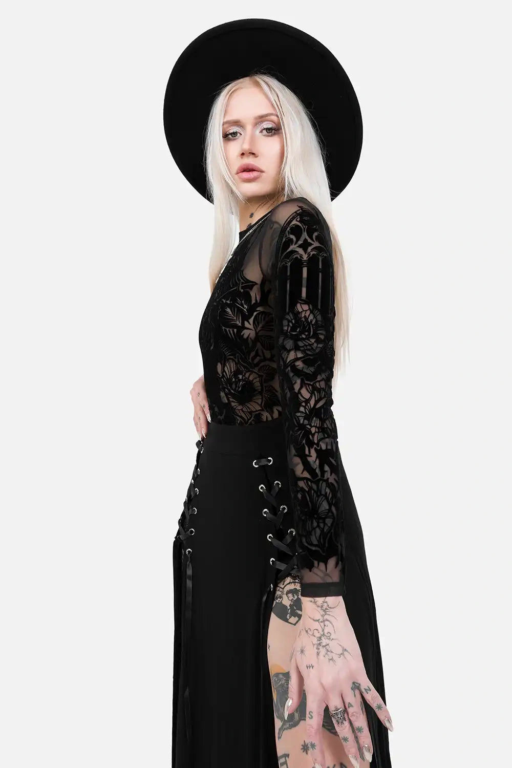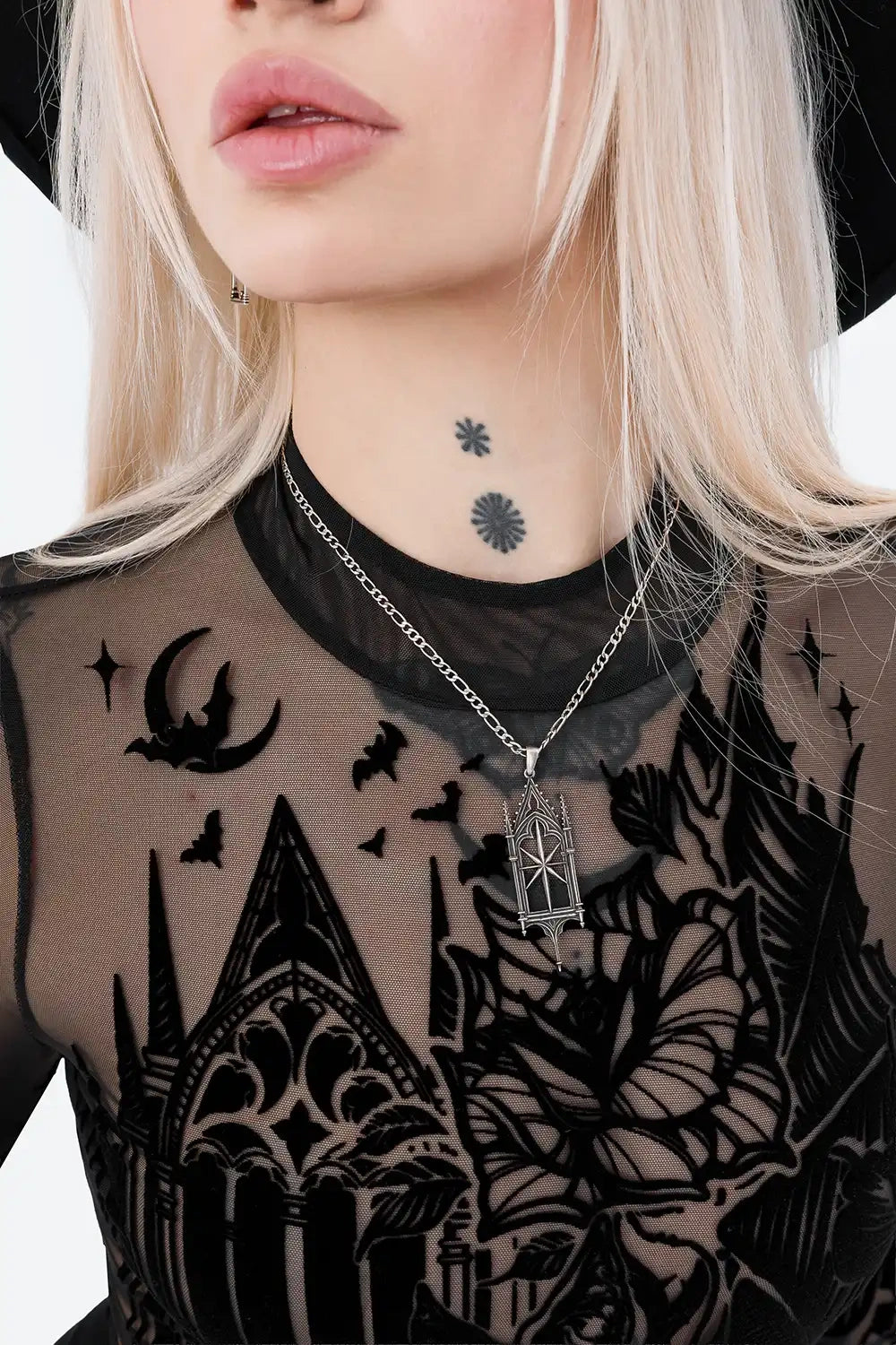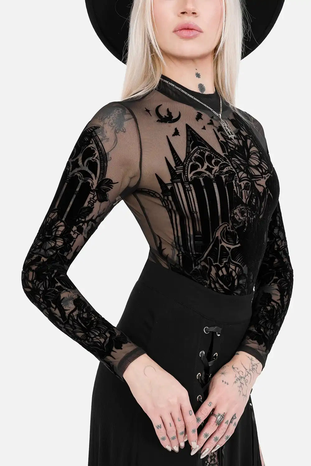 Where the night whispers its secrets, this black bodysuit brings gothic mystery to life. The flocked design features a haunting cathedral, large flowers, and a striking bat, creating a nocturnal, darkly elegant look. Perfect for dark fantasy, gothic, and whimsical styling, this bodysuit echoes the mysterious, night-inspired aesthetic of our Moon Garden collection - both share a nocturnal, ethereal vibe that celebrates shadowed beauty.