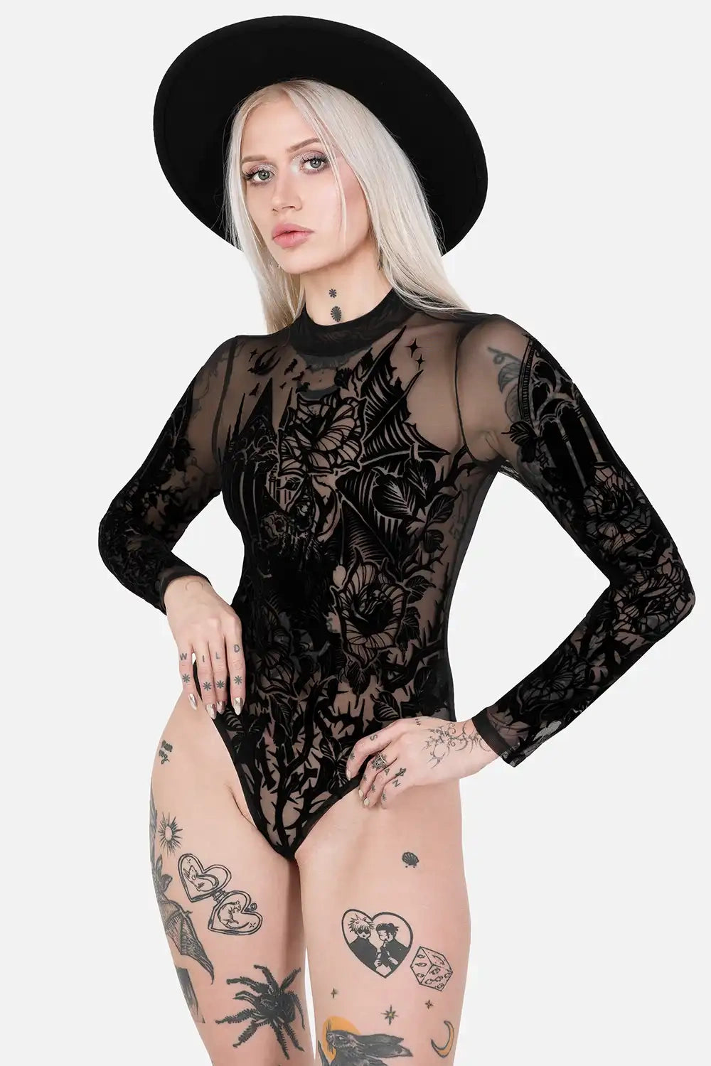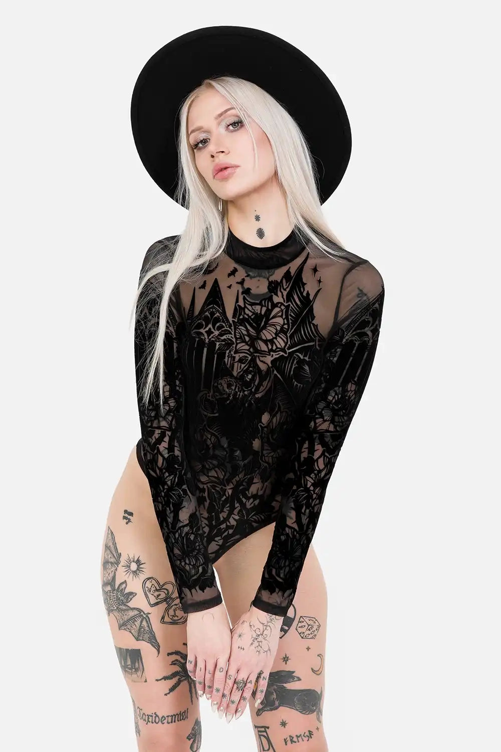 šš¦ VESPERTILIO BODYSUIT ā Gothic Mesh Bodysuit with Bat & Cathedral Flocking Print š